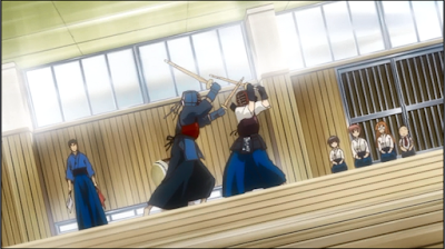 Carrie and Miyoko have one of the biggest rivalries in Bamboo Blade and their feud drove Miyako to become better at Kendo.  In these two matches Miyako is wearing blue and white and Carrie is wearing blue with red.
